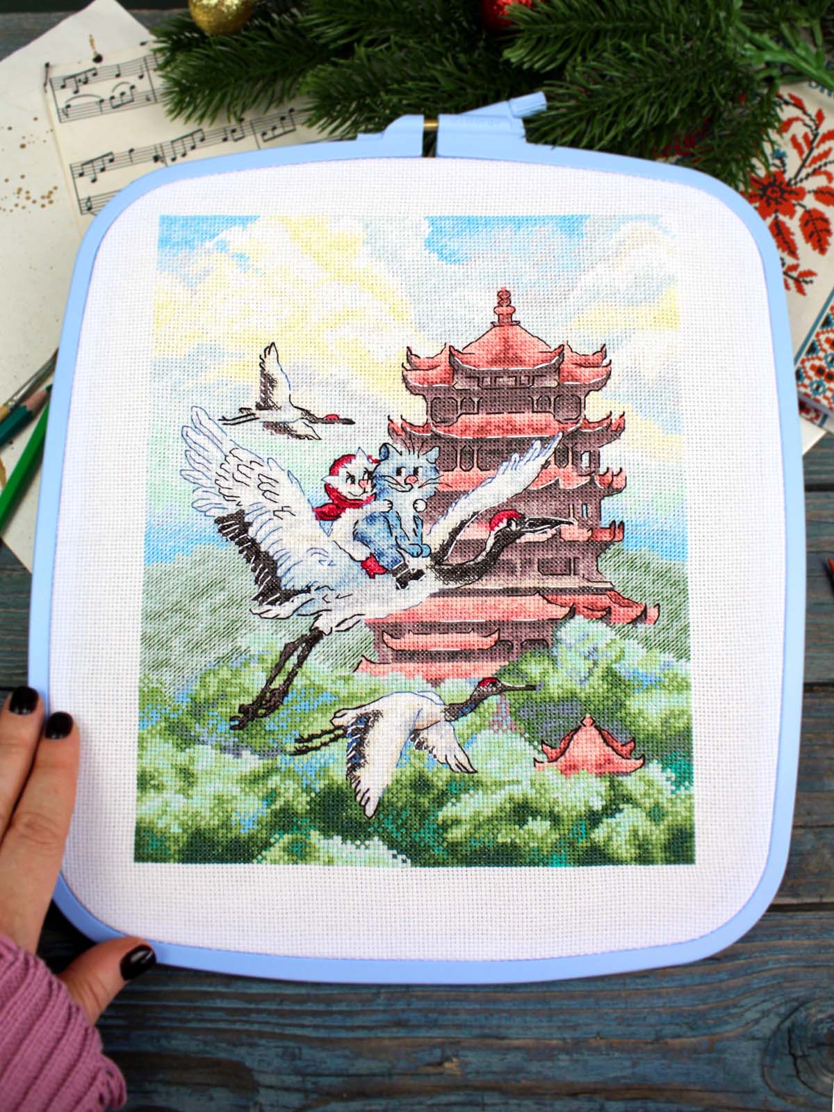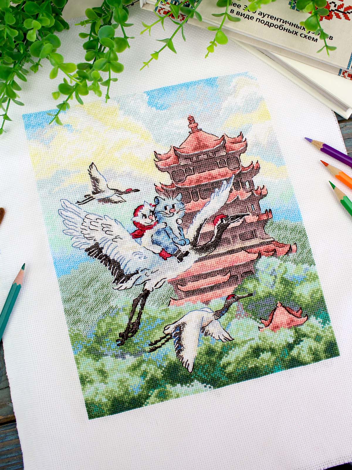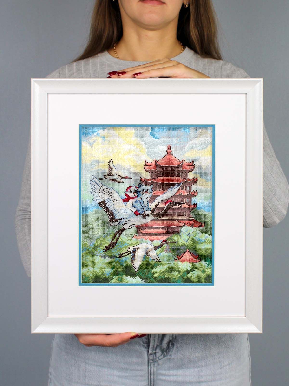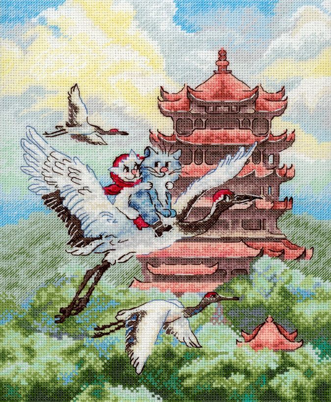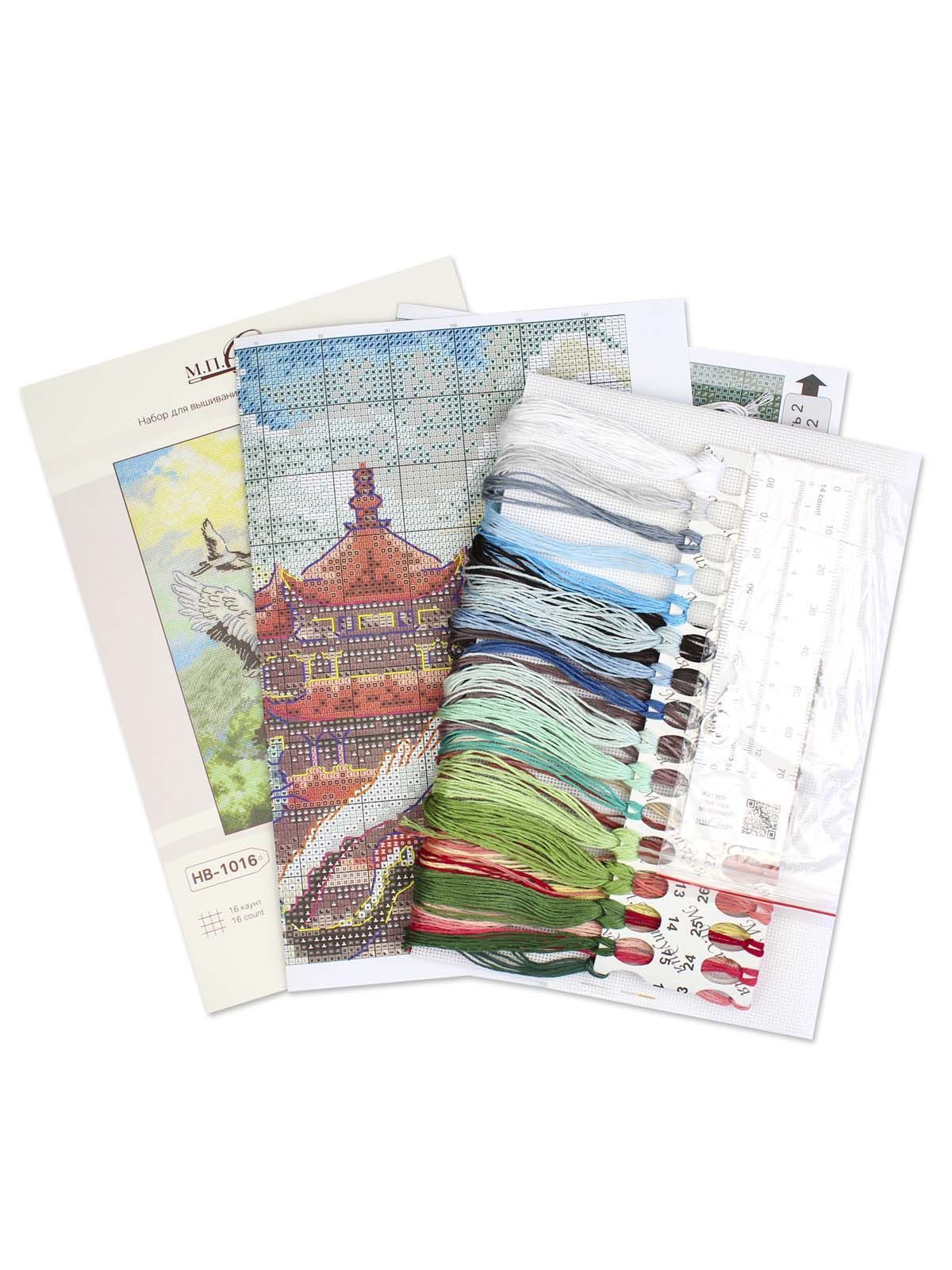 белая хлопчатобумажная канва 16 каунта, нитки мулине Гамма 33 цвета, разобранные на органайзере, игла, бумажная цвето-символьная схема и электронная схема Makosh, вышивальная линейка, нитковдеватель, руководство по вышиванию.