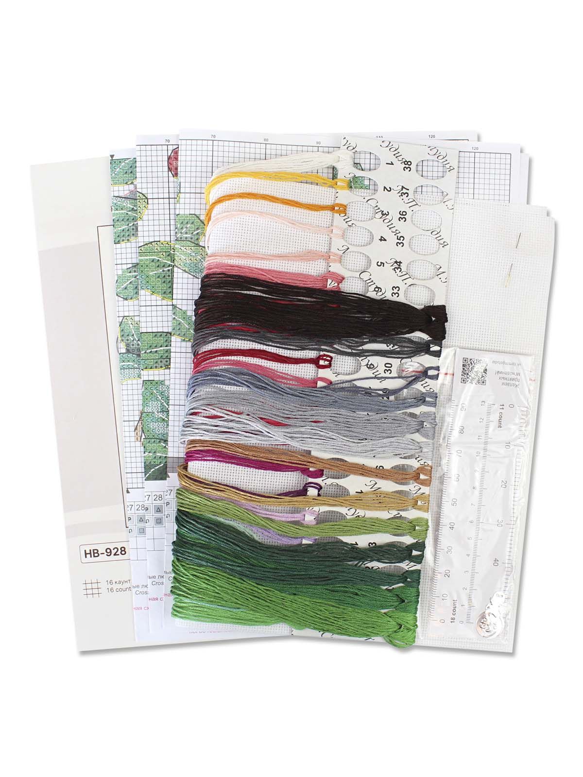 белая хлопчатобумажная канва 16 каунта, нитки мулине Гамма 32 цвета, разобранные на органайзере, игла, бумажная цвето-символьная схема и электронная схема Makosh, вышивальная линейка, нитковдеватель, руководство по вышиванию.