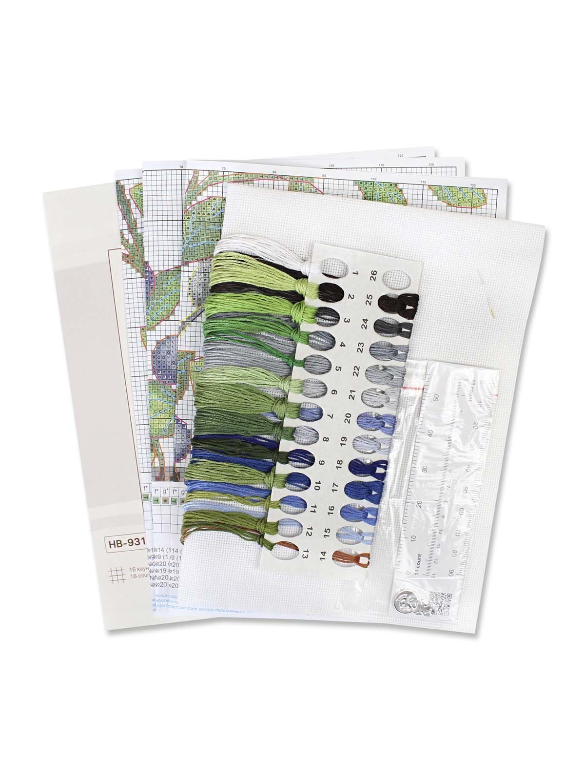 белая хлопчатобумажная канва 16 каунта, нитки мулине Гамма 25 цветов, разобранные на органайзере, игла, бумажная цвето-символьная схема и электронная схема Makosh, вышивальная линейка, нитковдеватель, руководство по вышиванию.