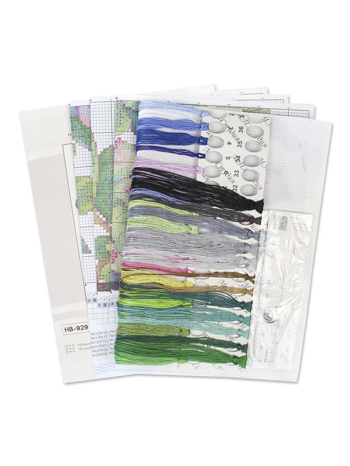 белая хлопчатобумажная канва 16 каунта, нитки мулине Гамма 31 цвет, разобранные на органайзере, игла, бумажная цвето-символьная схема и электронная схема Makosh, вышивальная линейка, нитковдеватель, руководство по вышиванию.