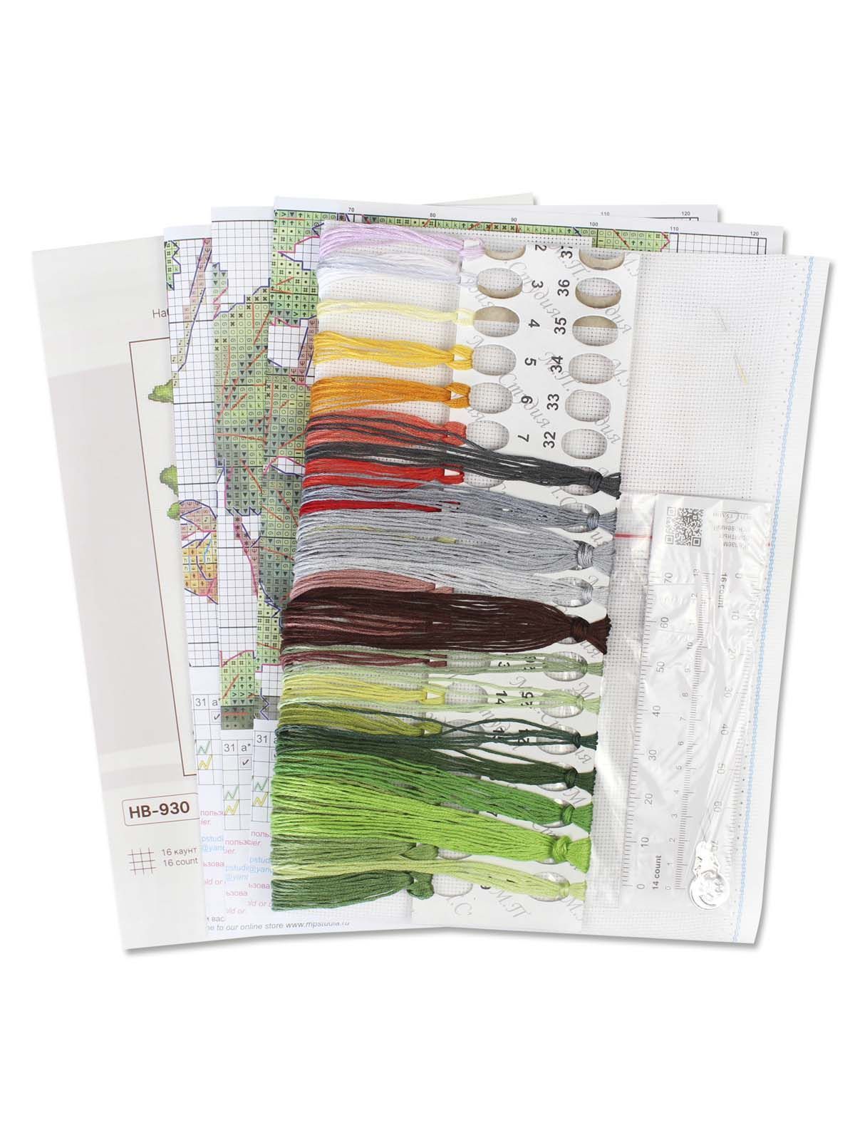 белая хлопчатобумажная канва 16 каунта, нитки мулине Гамма 31 цвет, разобранные на органайзере, игла, бумажная цвето-символьная схема и электронная схема Makosh, вышивальная линейка, нитковдеватель, руководство по вышиванию.