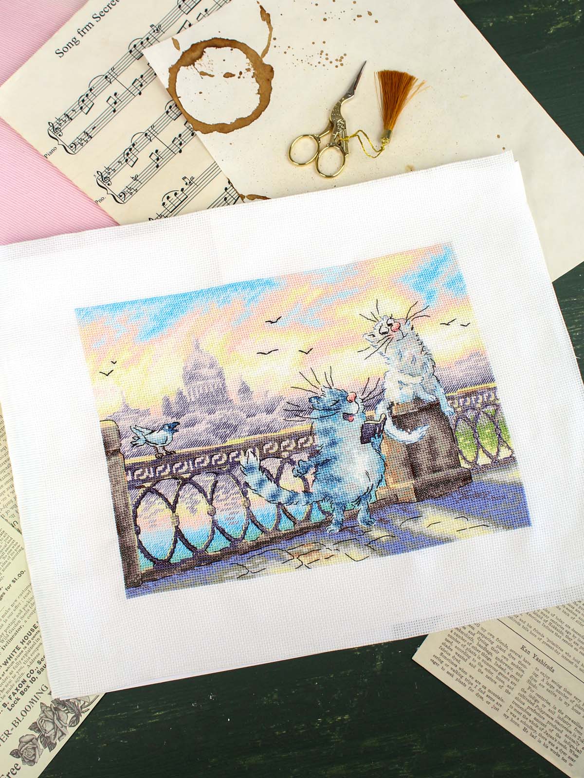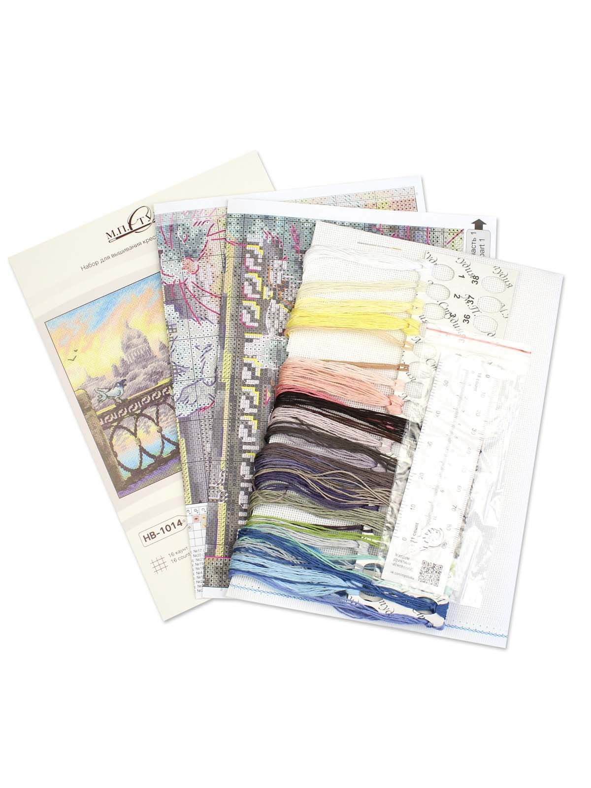 белая хлопчатобумажная канва 16 каунта, нитки мулине Гамма 30 цветов, разобранные на органайзере, игла, бумажная цвето-символьная схема и электронная схема Makosh, вышивальная линейка, нитковдеватель, руководство по вышиванию.