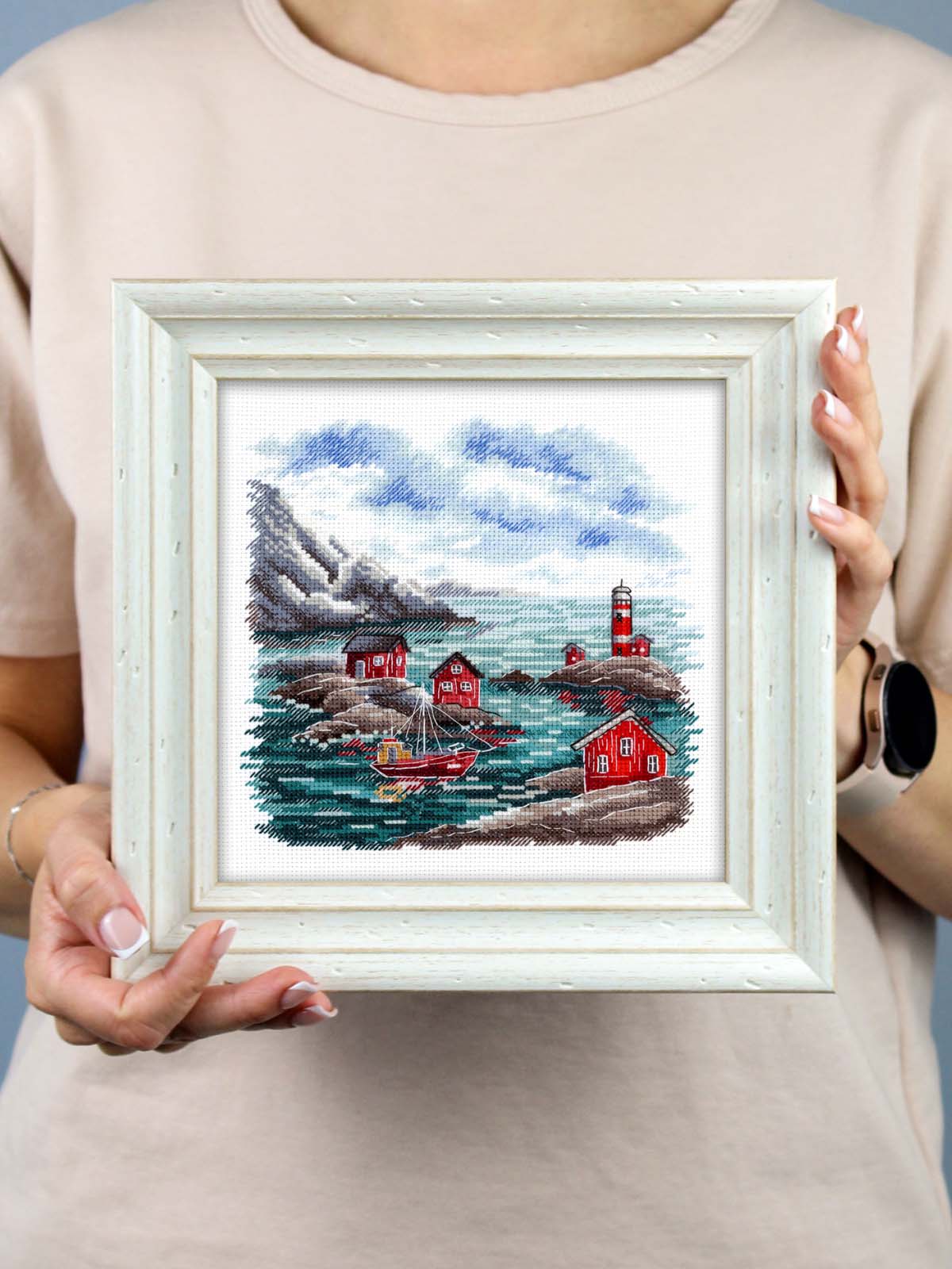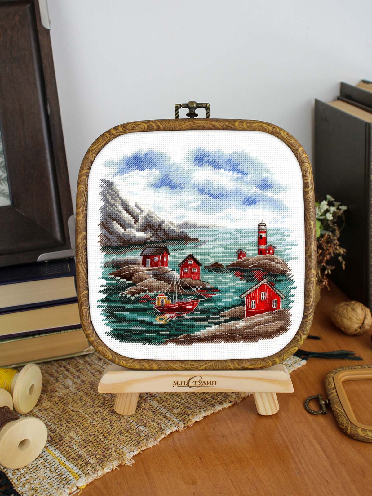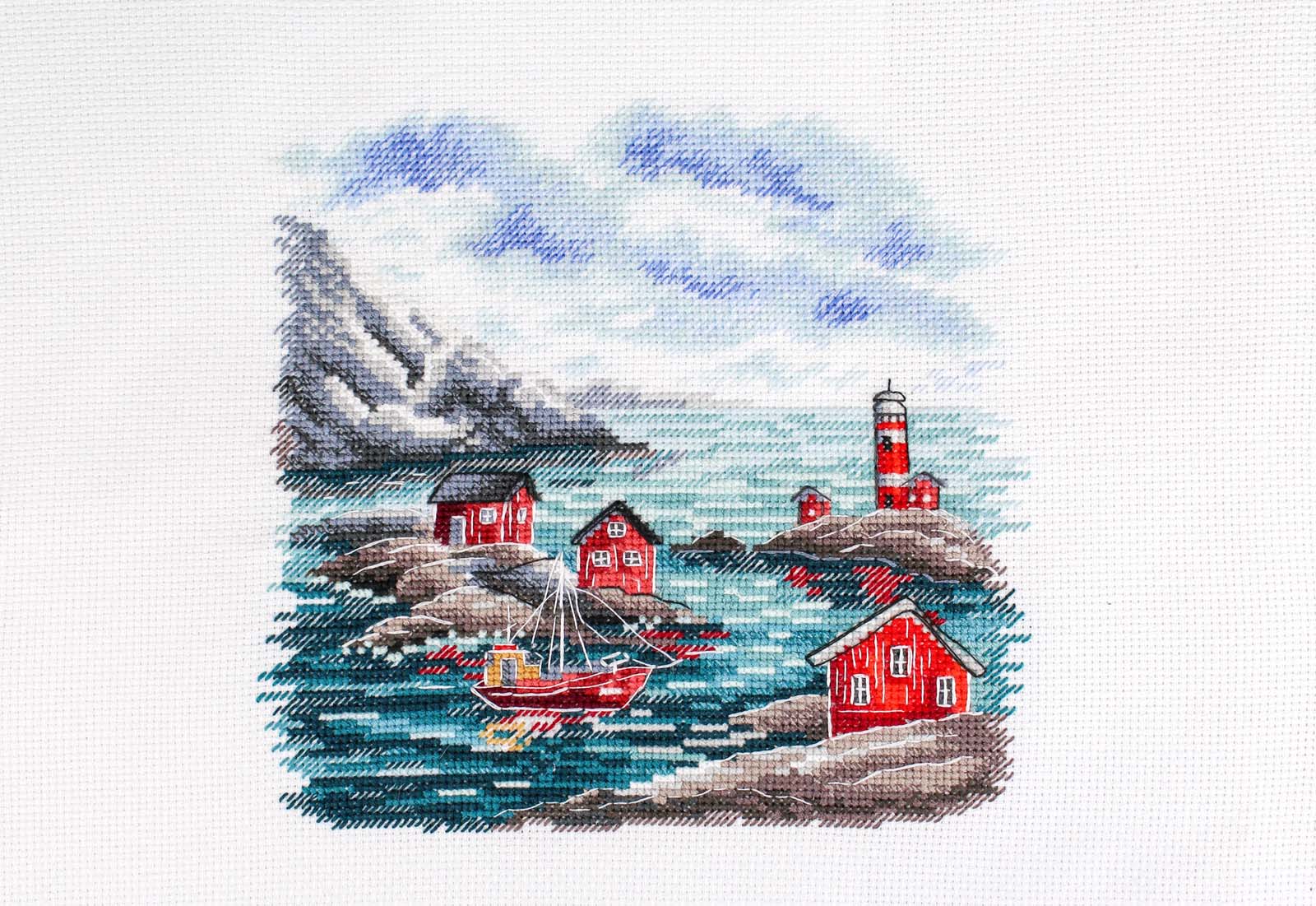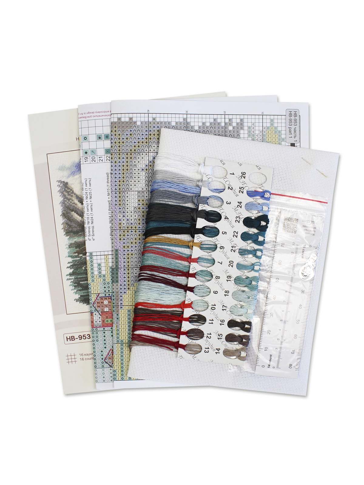 белая хлопчатобумажная канва 16 каунта, нитки мулине Гамма 25 цветов, разобранные на органайзере, игла, бумажная цвето-символьная схема и электронная схема Makosh, вышивальная линейка, нитковдеватель, руководство по вышиванию.
