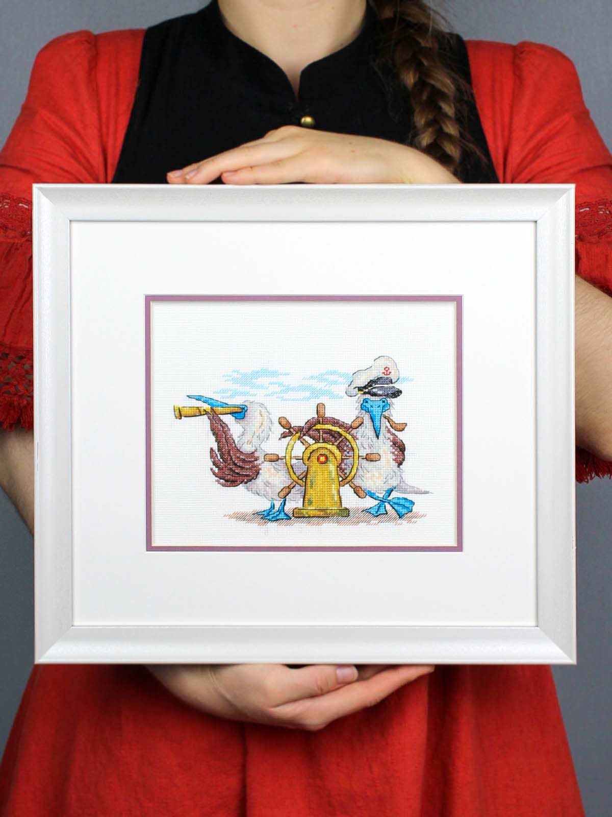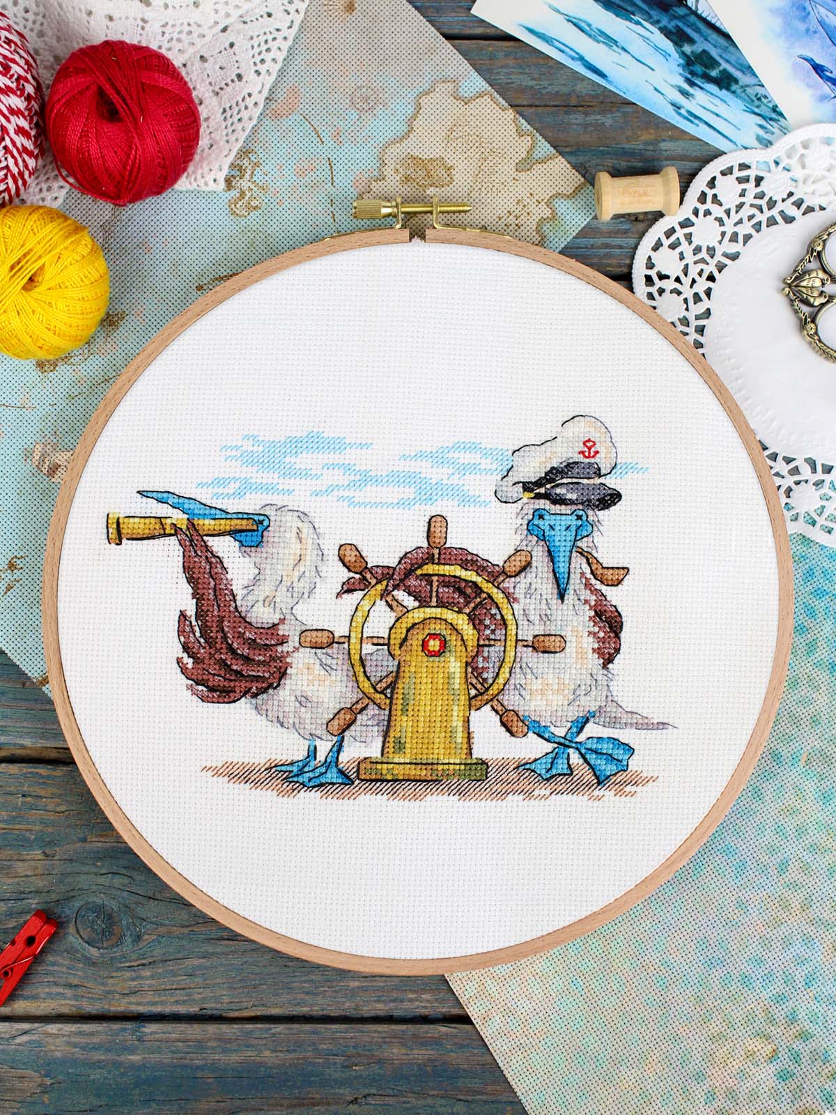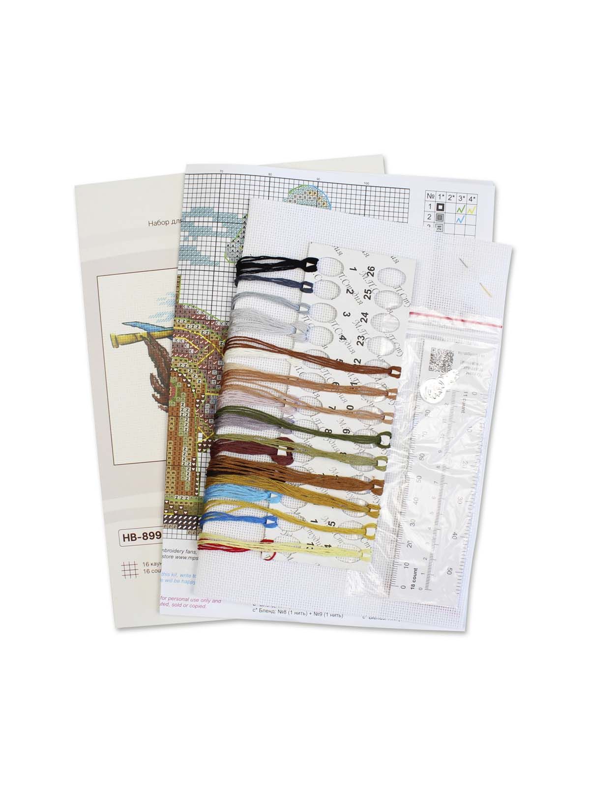 белая хлопчатобумажная канва 16 каунта, нитки мулине Гамма 22 цвета, разобранные на органайзере, игла, бумажная цвето-символьная схема и электронная схема Makosh, вышивальная линейка, нитковдеватель, руководство по вышиванию.