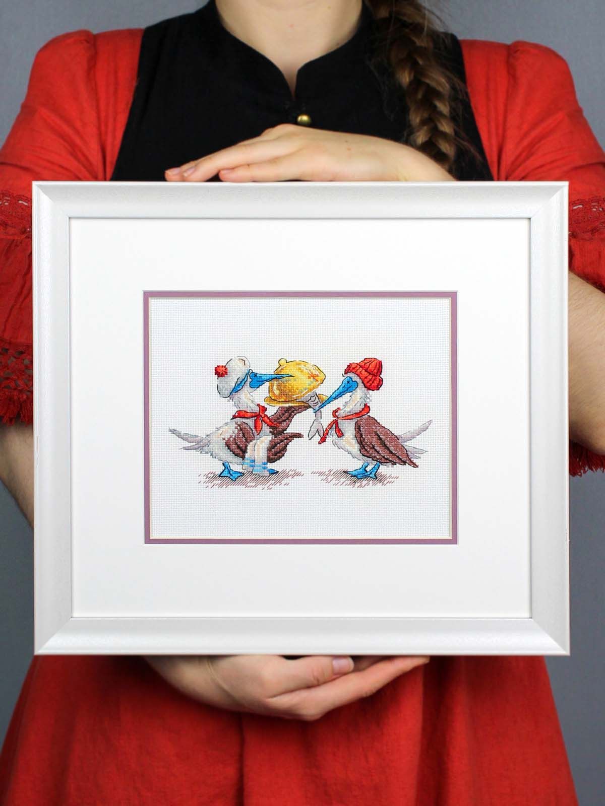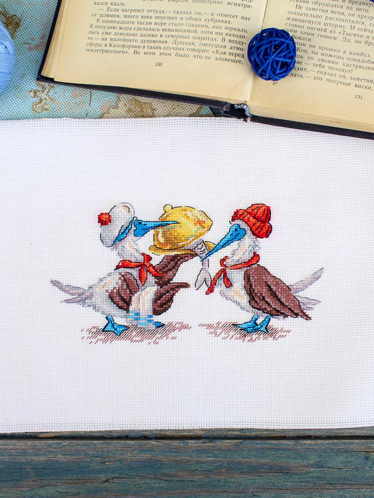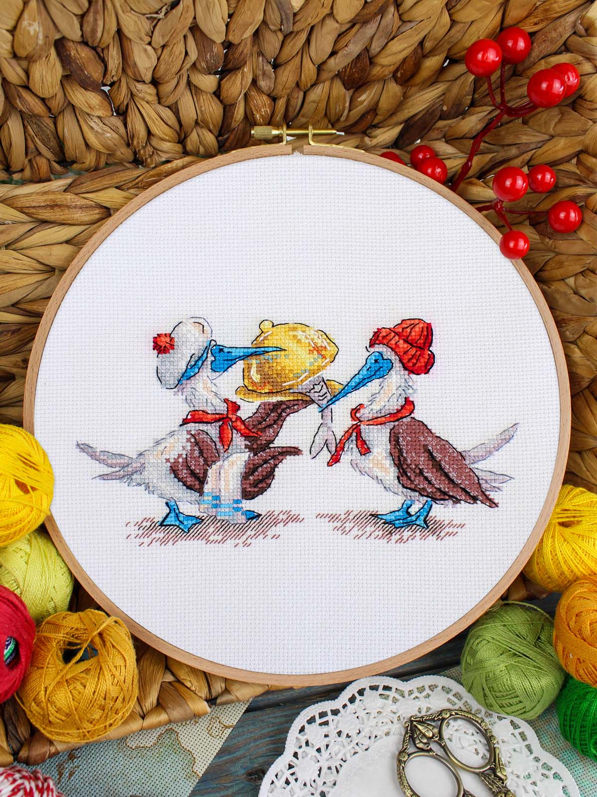 белая хлопчатобумажная канва 16 каунта, нитки мулине Гамма 20 цветов, разобранные на органайзере, игла, бумажная цвето-символьная схема и электронная схема Makosh, вышивальная линейка, нитковдеватель, руководство по вышиванию.