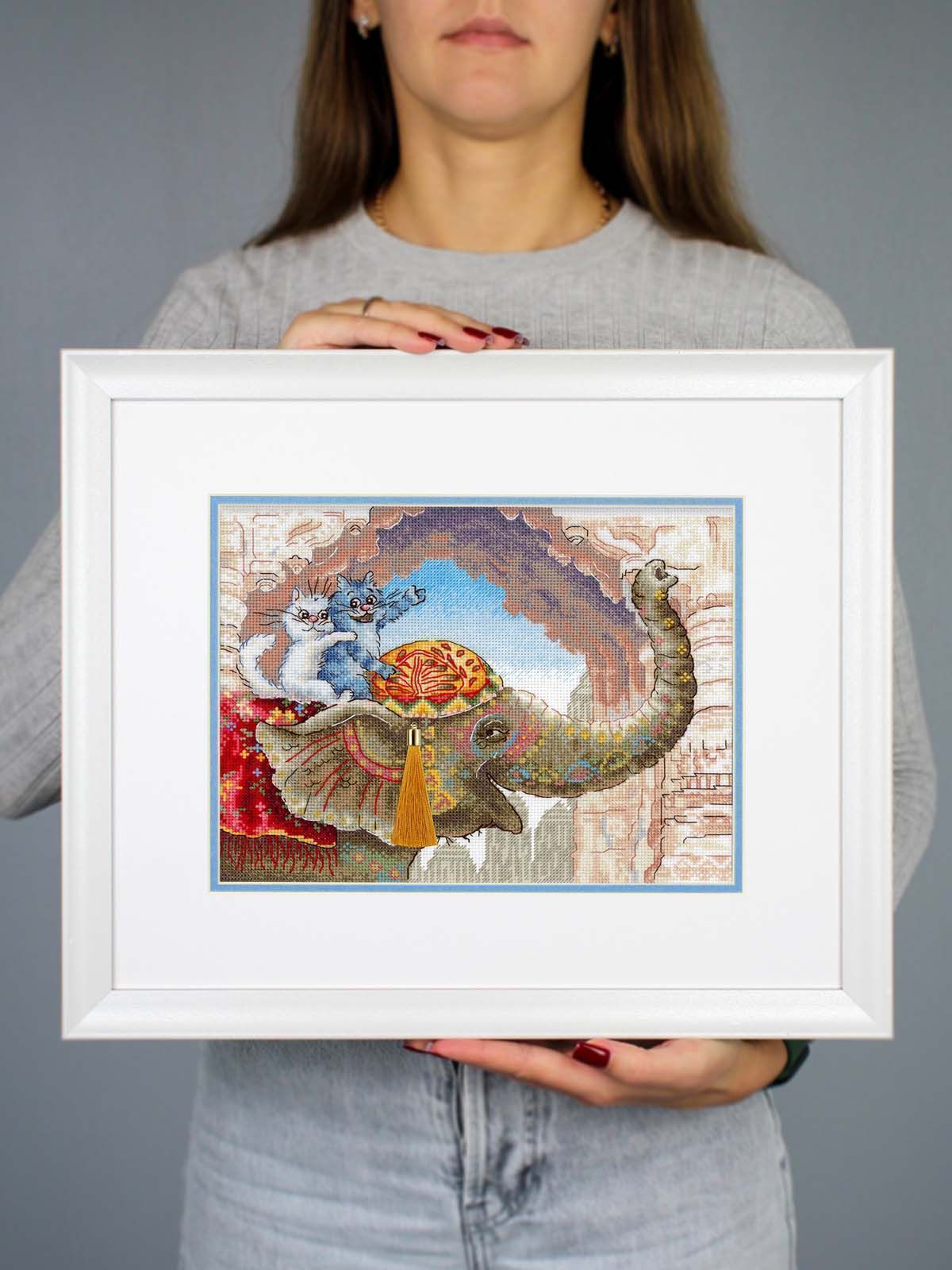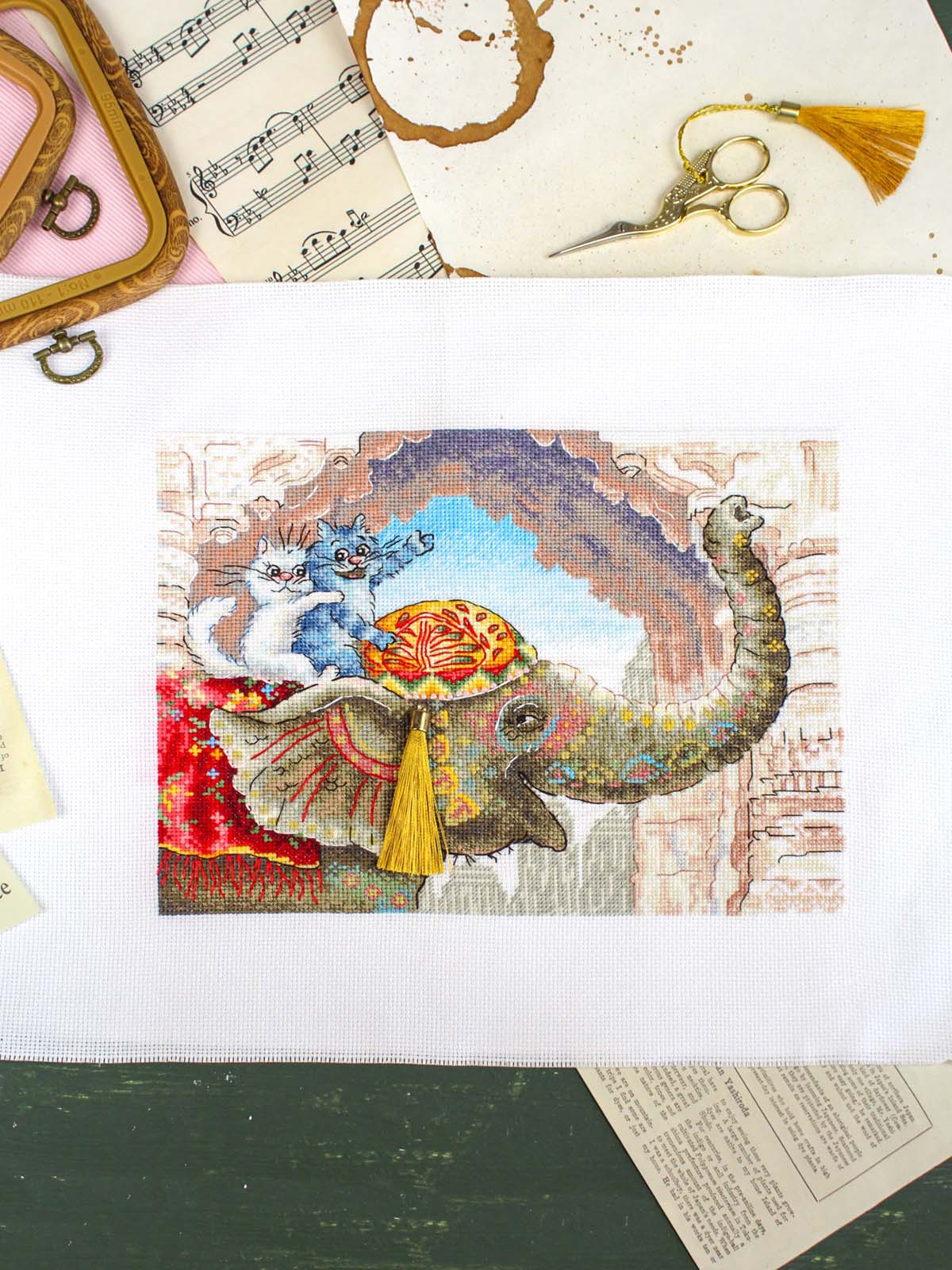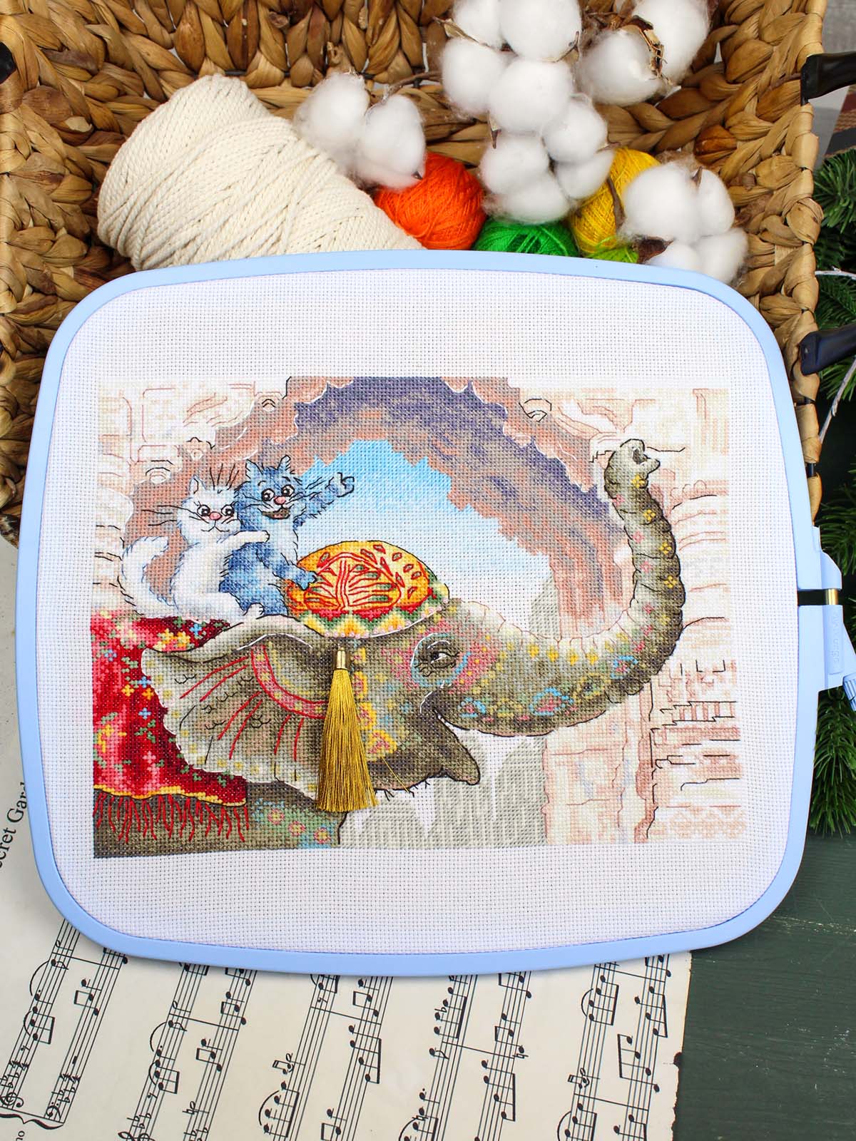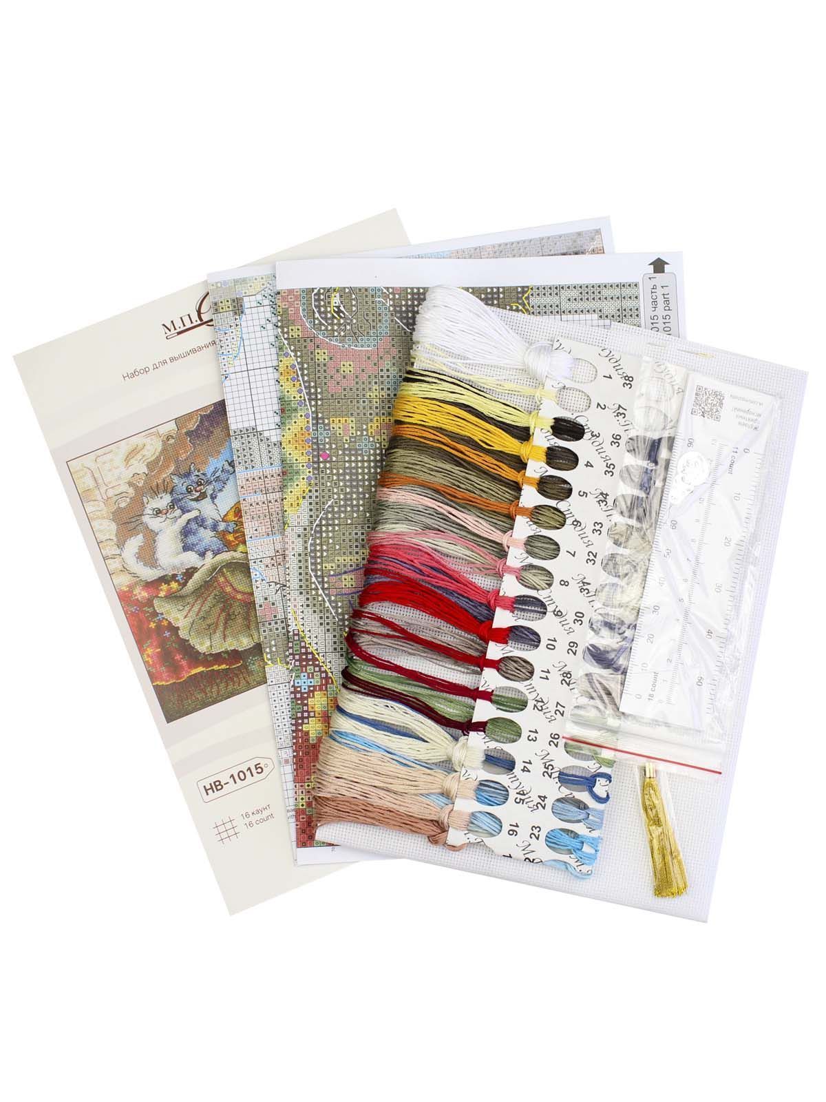 белая хлопчатобумажная канва 16 каунта, нитки мулине Гамма 36 цветов, разобранные на органайзере, кисточка, игла, бумажная цвето-символьная схема и электронная схема Makosh, вышивальная линейка, нитковдеватель, руководство по вышиванию.