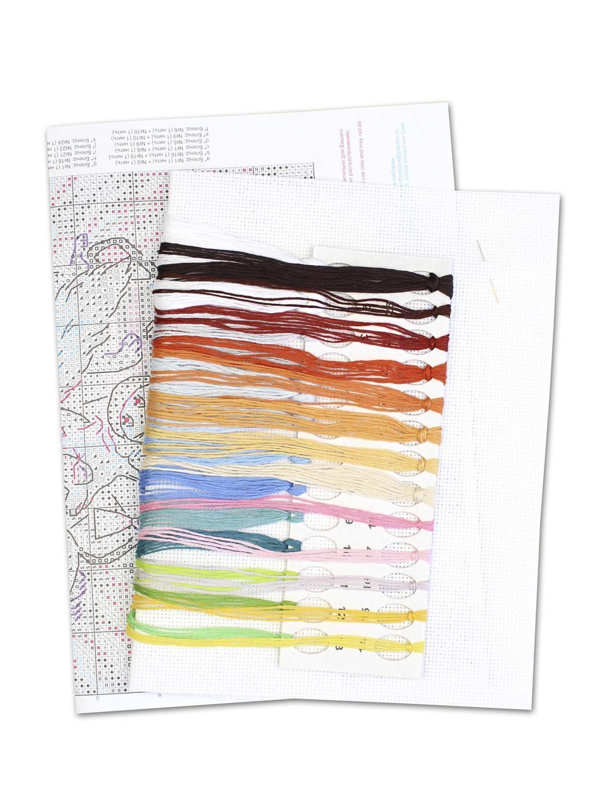 белая канва 14 каунта, нитки мулине ПНК им.Кирова 26 цветов, разобранные на органайзере, игла, схема бумажная и электронная Makosh, руководство по вышиванию.