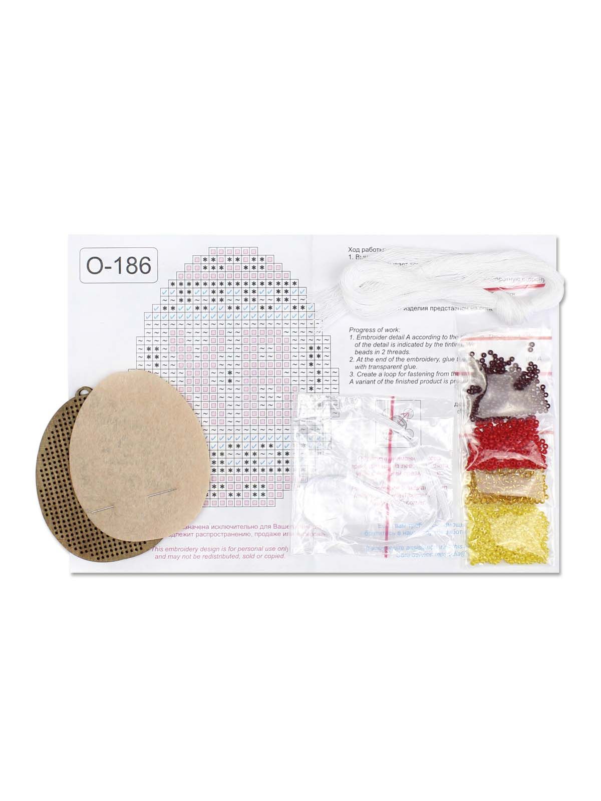 перфорированная деревянная основа, 4 цвета бисера Preciosa, швейные нити, игла, белая лента, фетр для обработки изнанки, бумажная символьная схема и электронная схема Makosh, инструкция по выполнению работы.