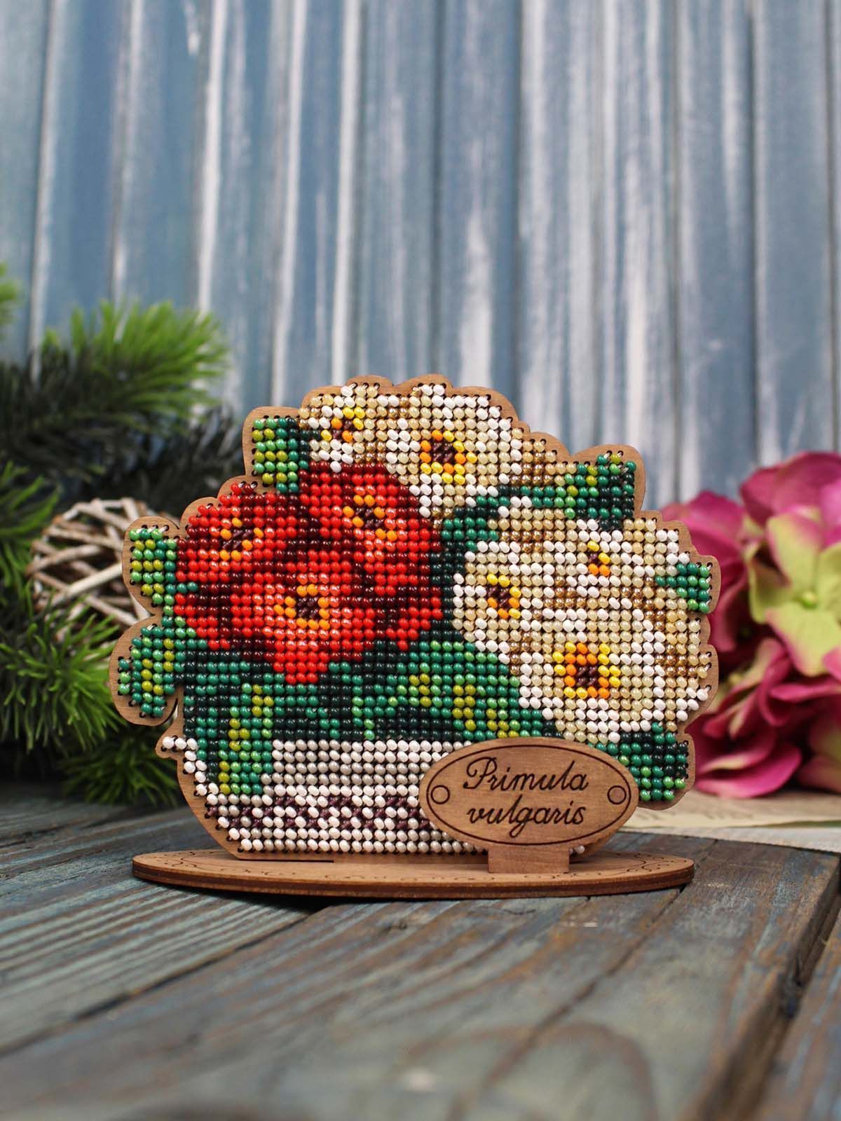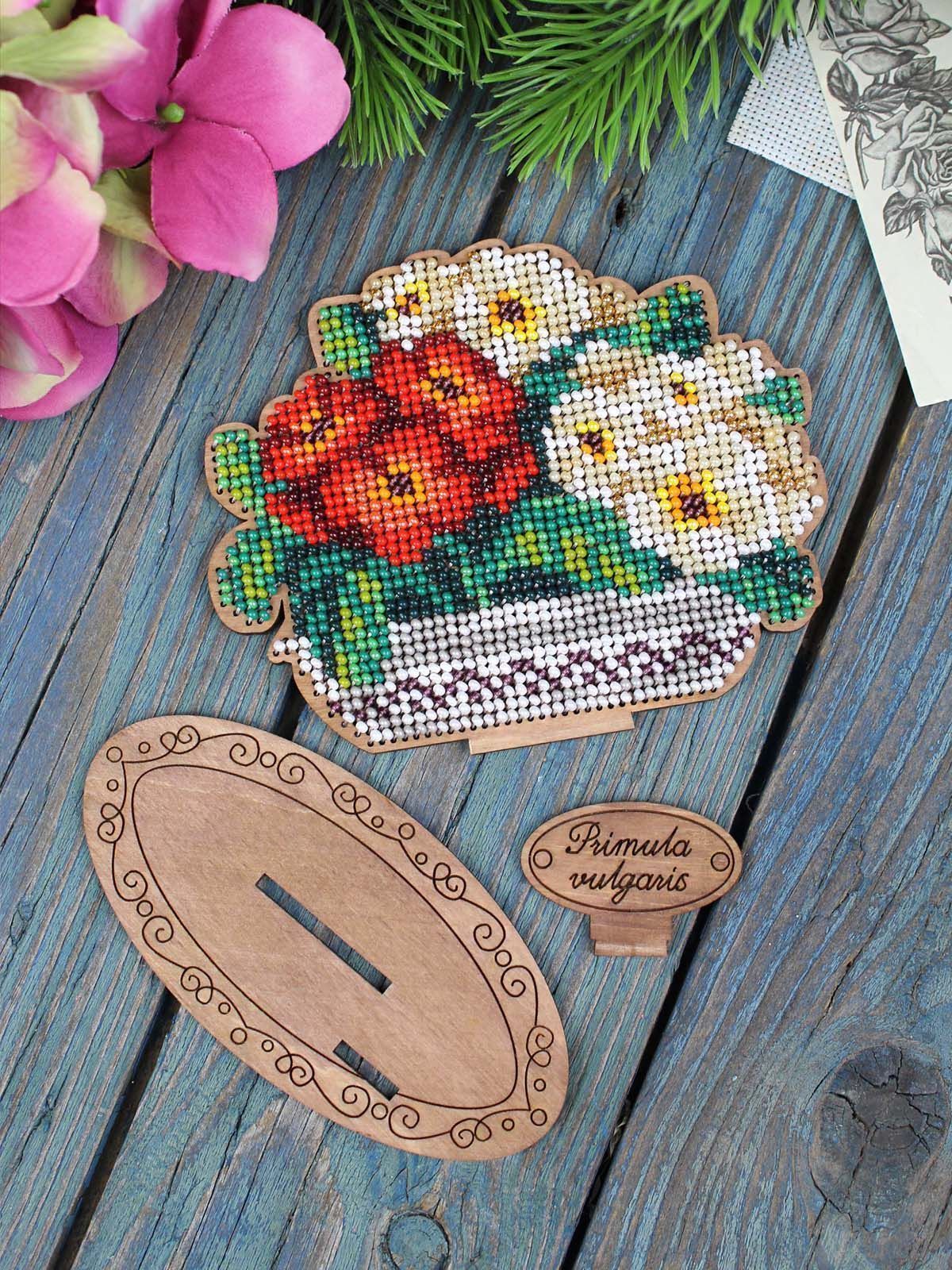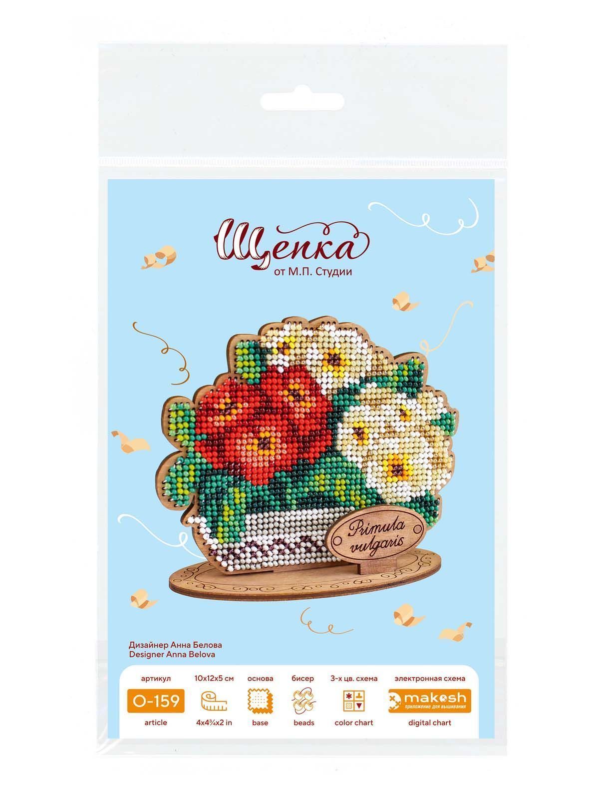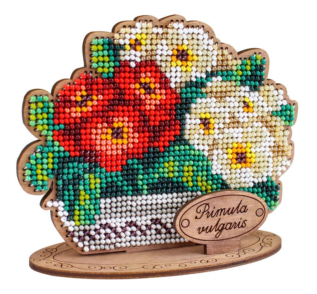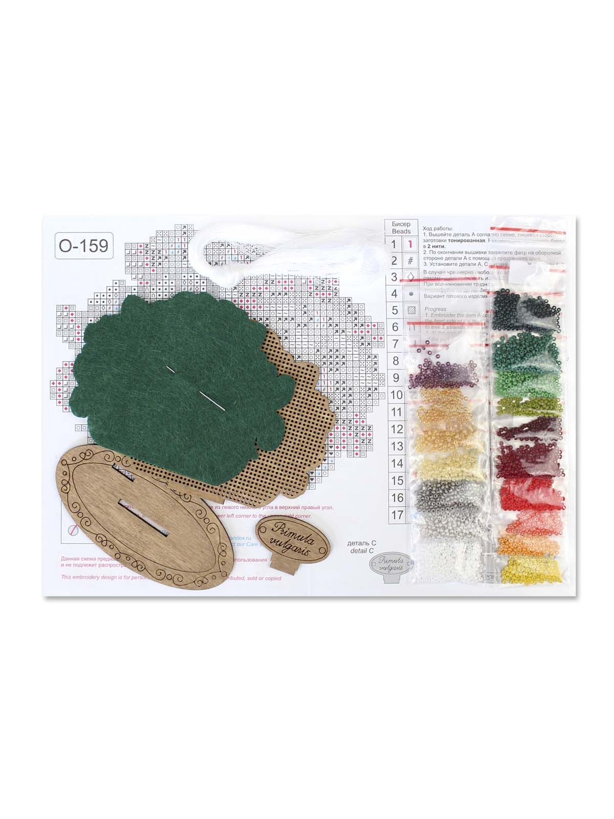 перфорированная деревянная основа, 17 цветов бисера Preciosa, швейные нити, игла, подставка, фетр для обработки изнанки, бумажная символьная схема и электронная схема Makosh, инструкция по выполнению работы.