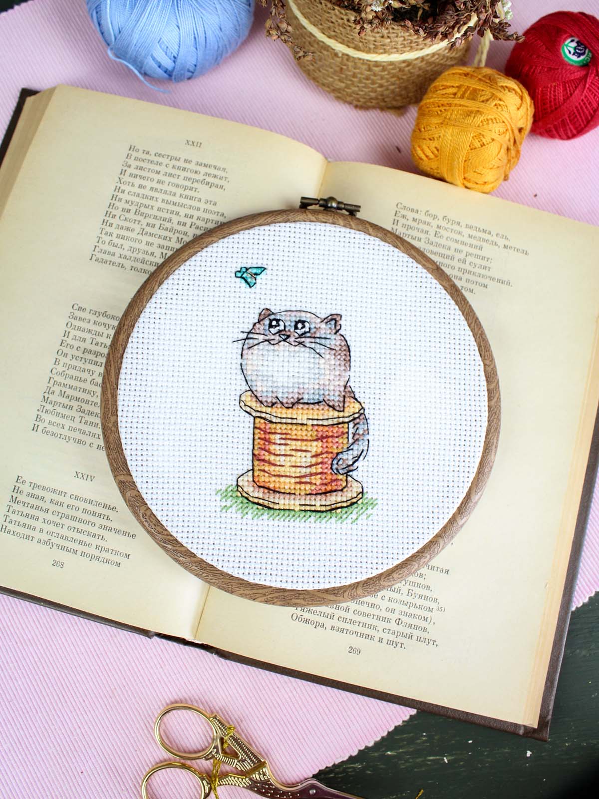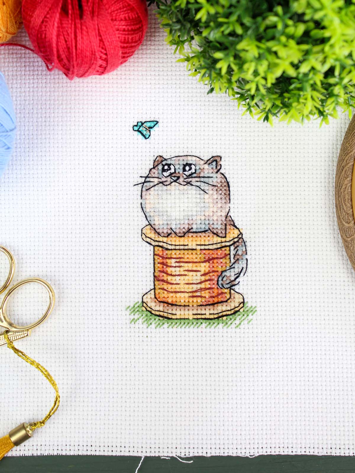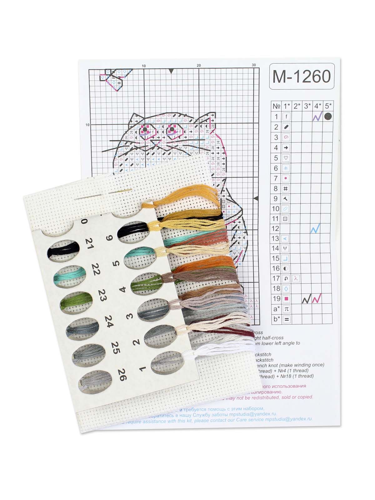 белая канва 14 каунта, нитки мулине ПНК им.Кирова 19 цветов, разобранные на органайзере, игла, схема бумажная и электронная Makosh, руководство по вышиванию.