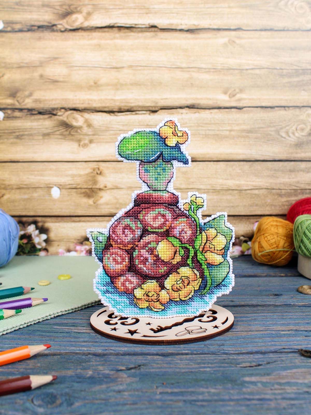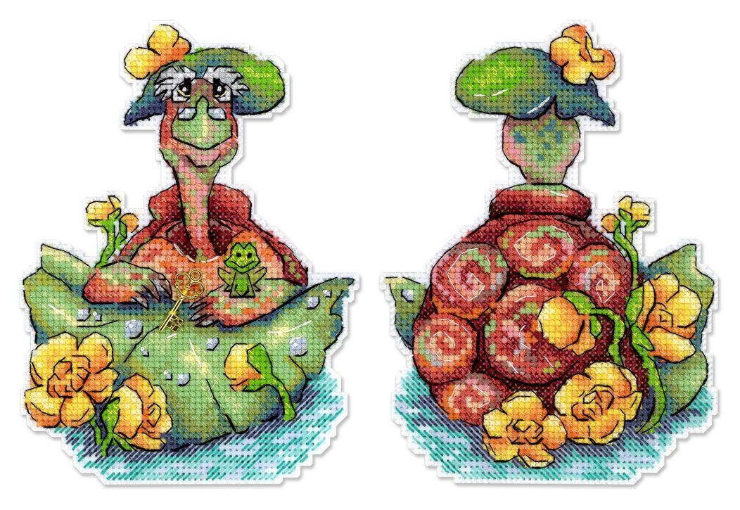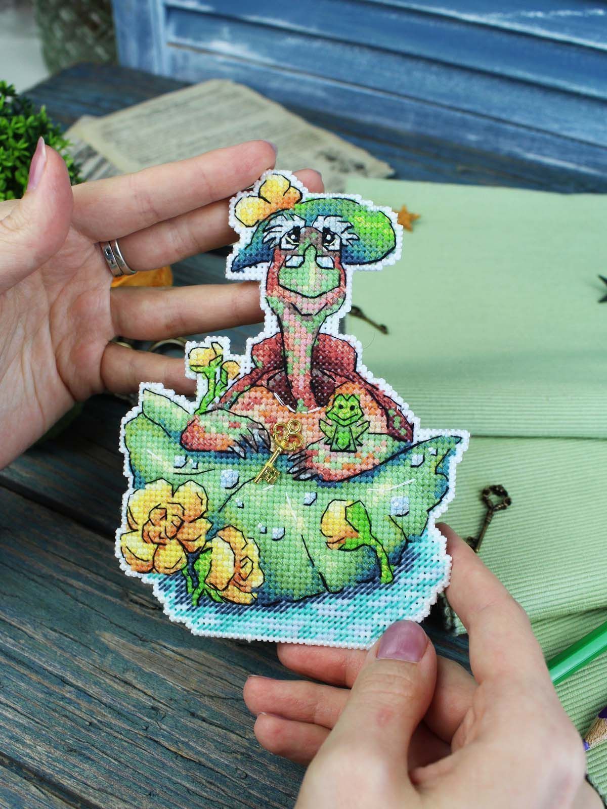 белая пластиковая канва 14 каунта, нитки мулине ПНК им.Кирова 21 цвет, разобранные на органайзере, декор - ключик, игла, схема бумажная и электронная Makosh, руководство по вышиванию.