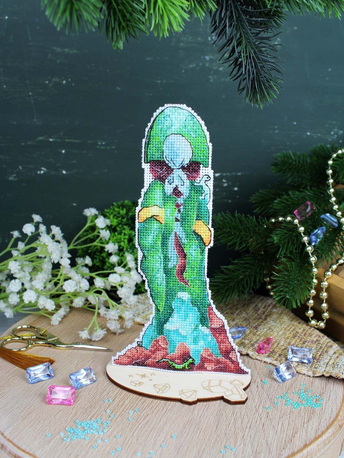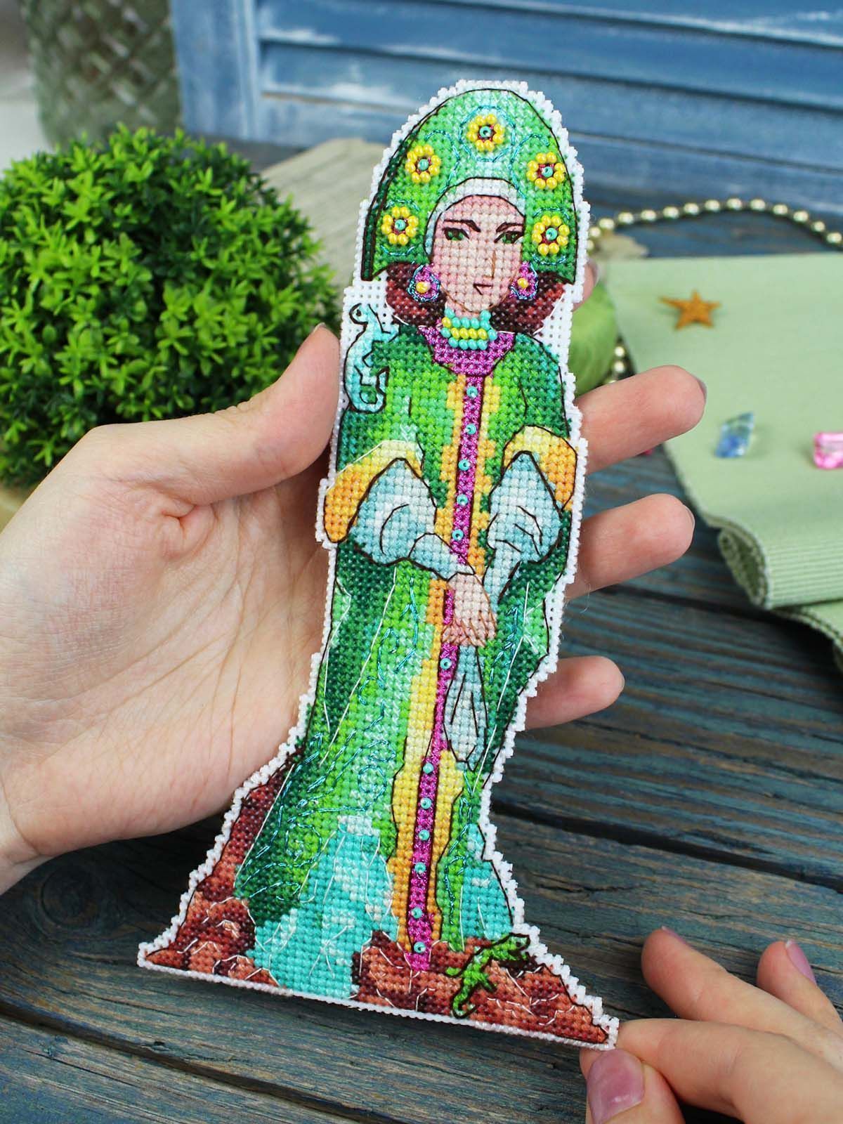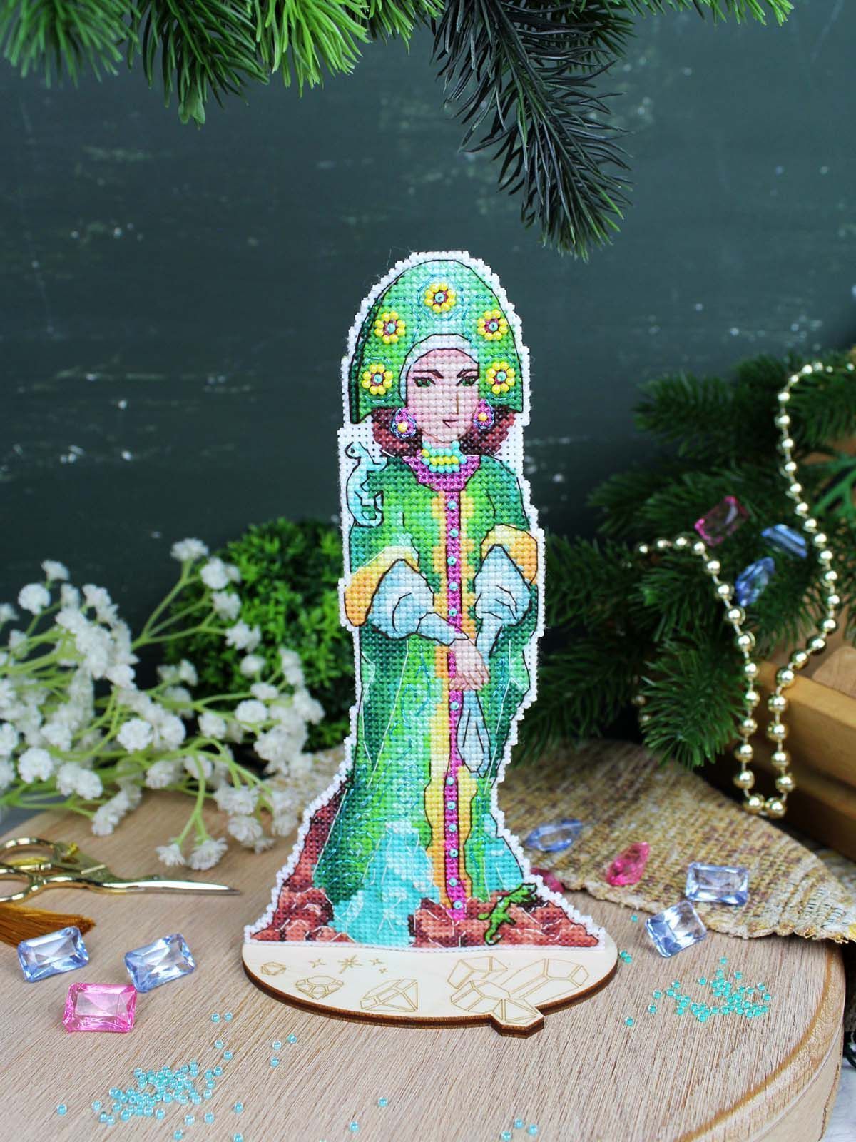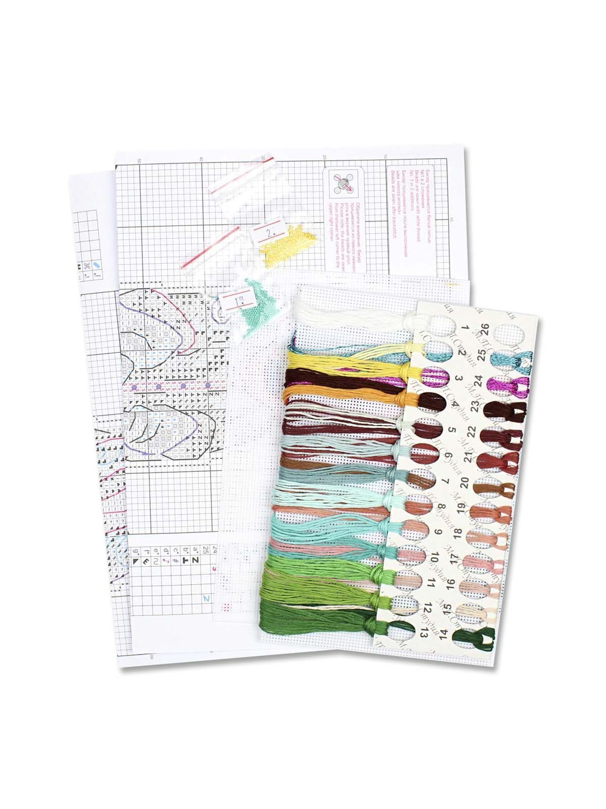 белая пластиковая канва 14 каунта, нитки мулине ПНК им.Кирова 23 цвета, разобранные на органайзере, нитки металлик, бисер, игла, схема бумажная и электронная Makosh, руководство по вышиванию.