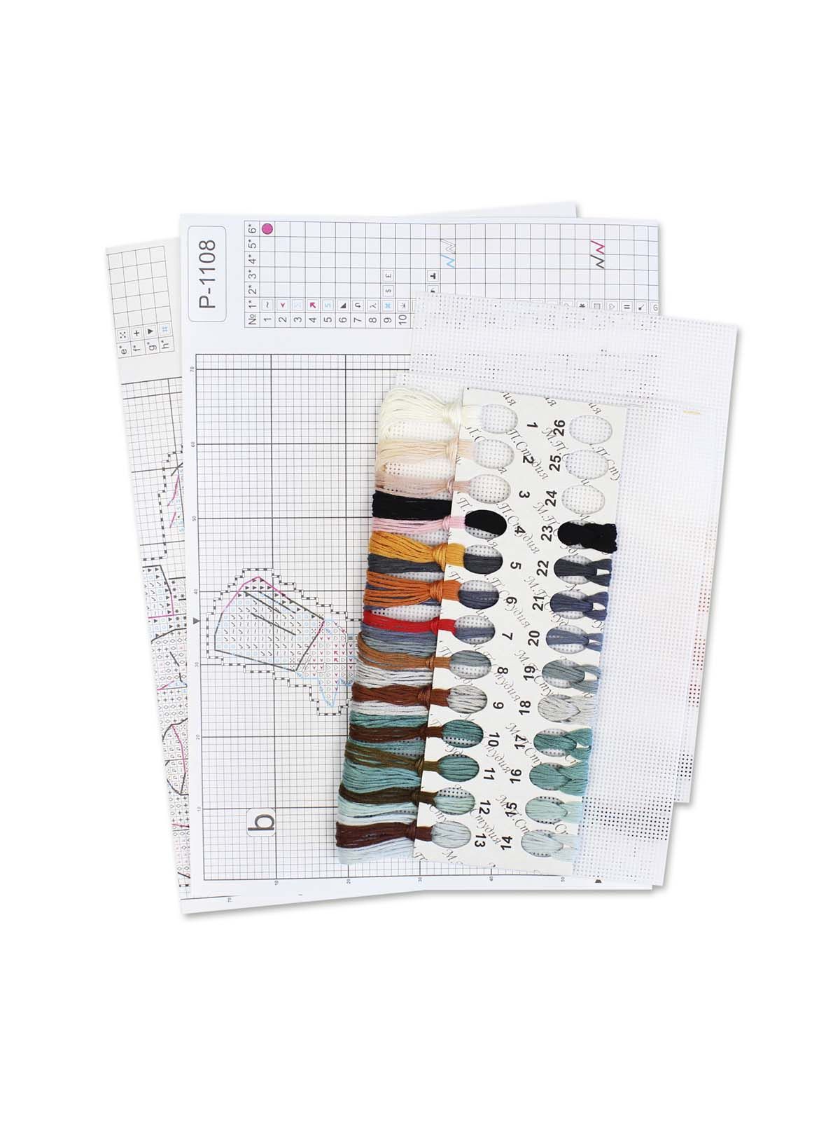 В состав набора входит: белая пластиковая канва 14 каунта, нитки мулине ПНК им.Кирова 23 цвета, разобранные на органайзере, игла, схема бумажная и электронная Makosh, руководство по вышиванию.