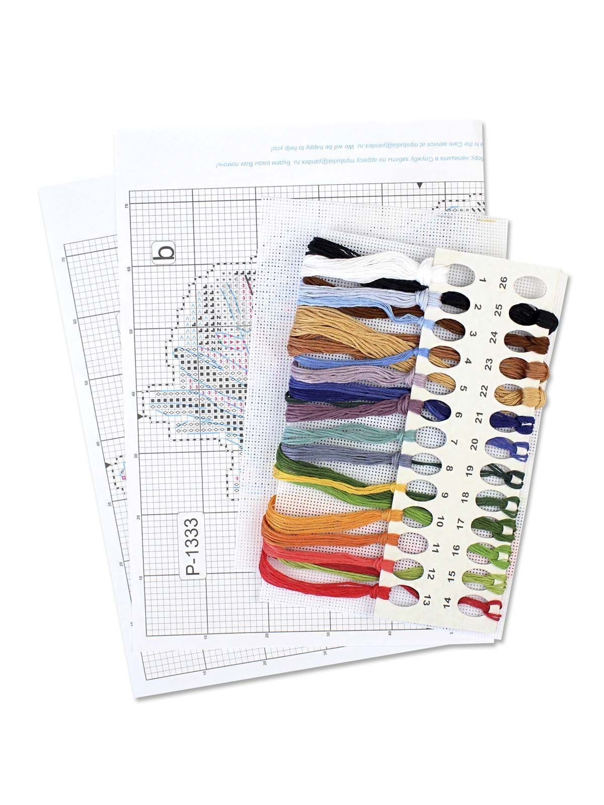 белая пластиковая канва 14 каунта, нитки мулине ПНК им.Кирова 25 цветов, разобранные на органайзере, игла, схема бумажная и электронная Makosh, руководство по вышиванию.