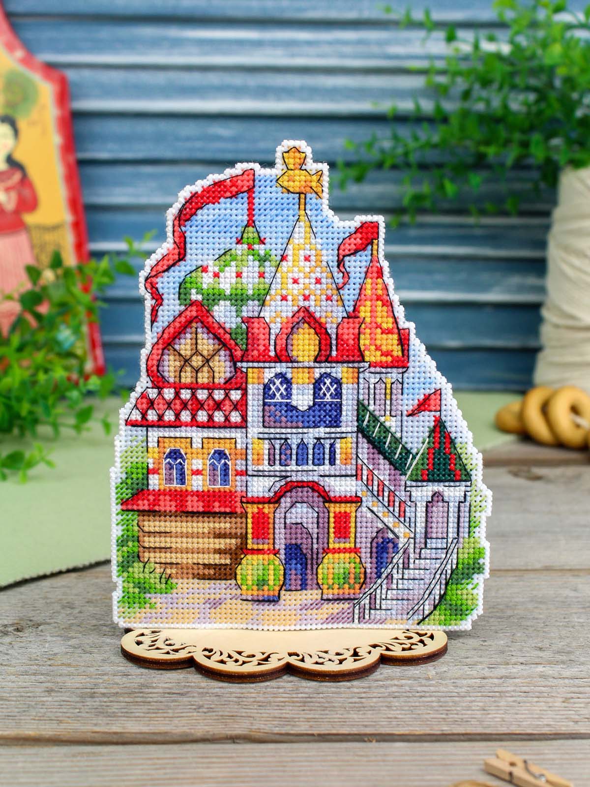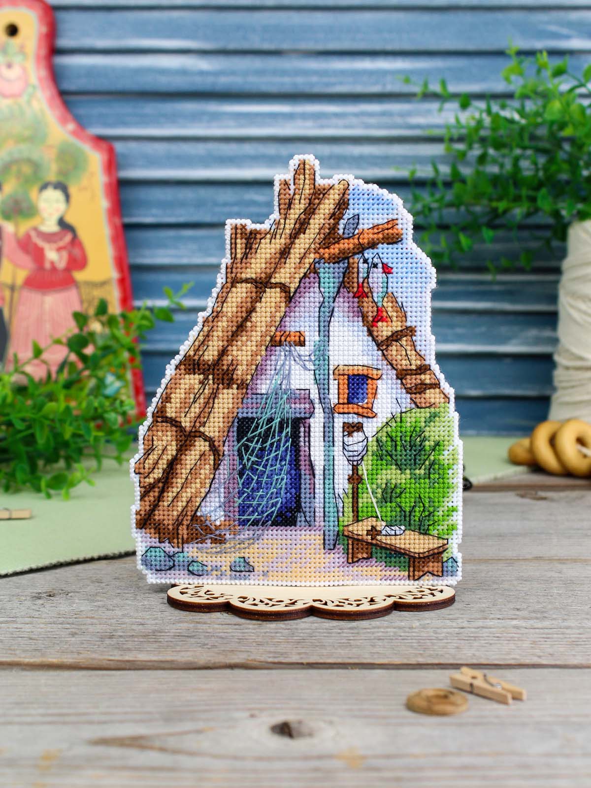 Обе стороны избушки вышиваются согласно схеме, затем вырезаются по контуру, обозначенному в руководстве по вышиванию, и сшиваются изнаночными сторонами внутрь.