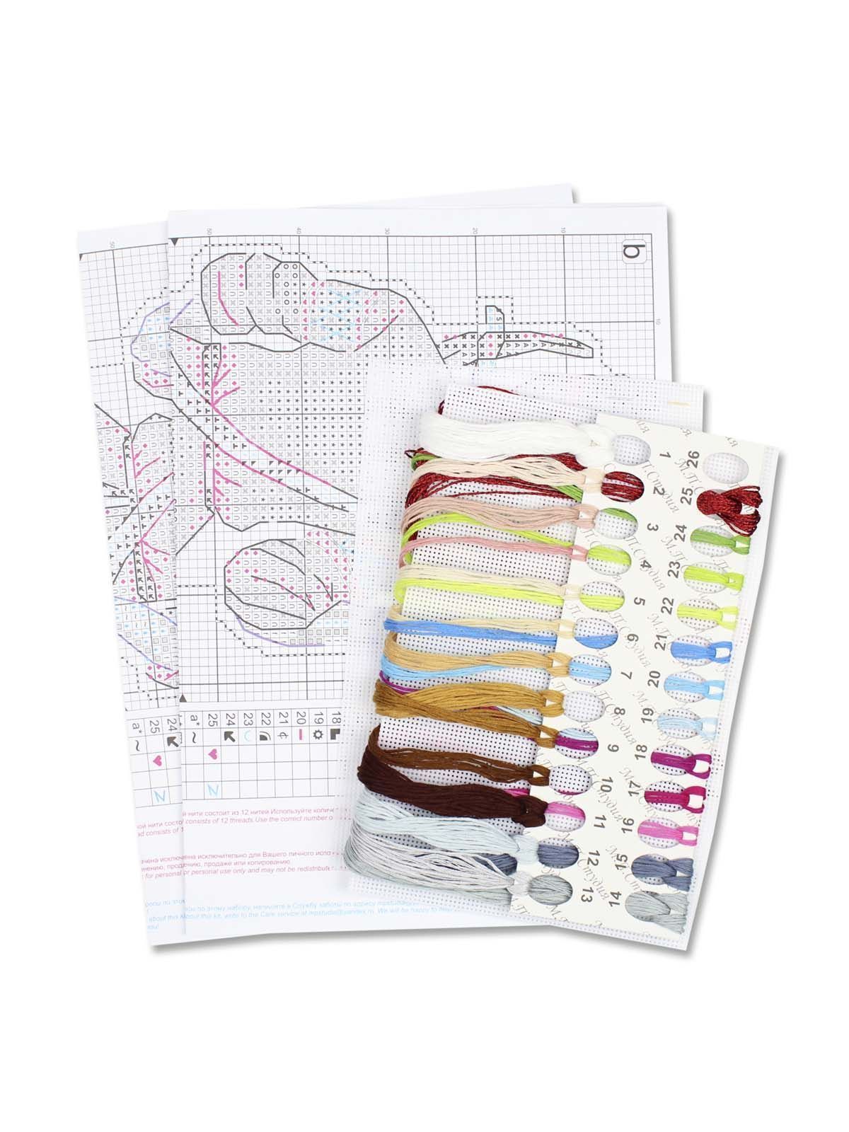 В состав набора входит: белая пластиковая канва 14 каунта, нитки мулине ПНК им.Кирова 24 цвета, разобранные на органайзере, нитки металлик, игла, схема бумажная и электронная Makosh, руководство по вышиванию.