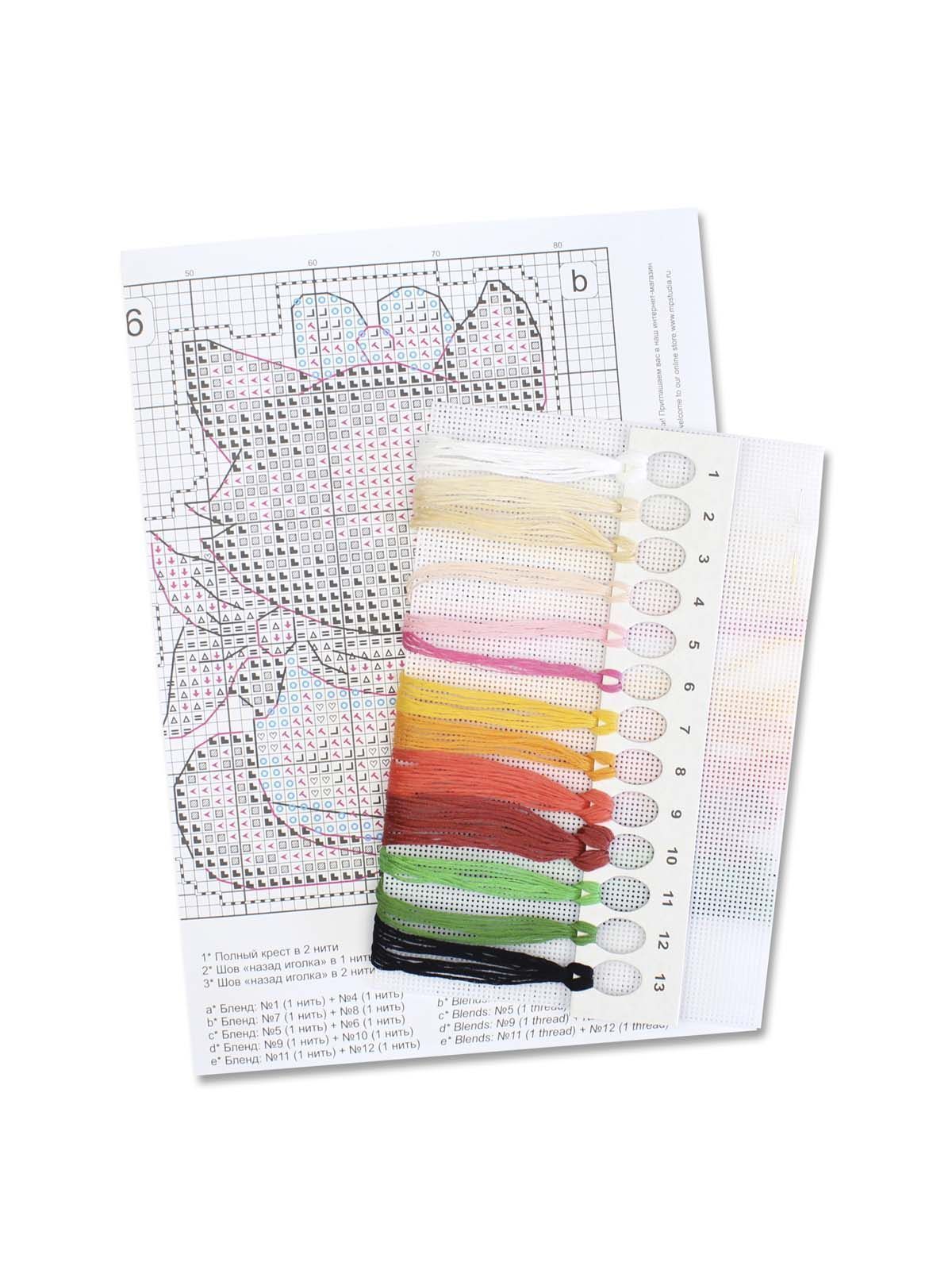 В состав набора входит: белая пластиковая канва 14 каунта, нитки мулине ПНК им.Кирова 13 цветов, разобранные на органайзере, игла, схема бумажная и электронная Makosh, руководство по вышиванию.