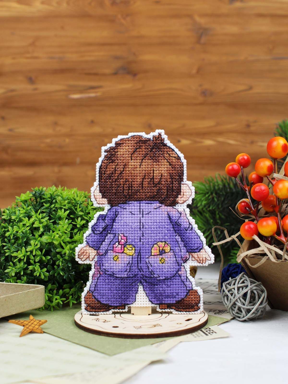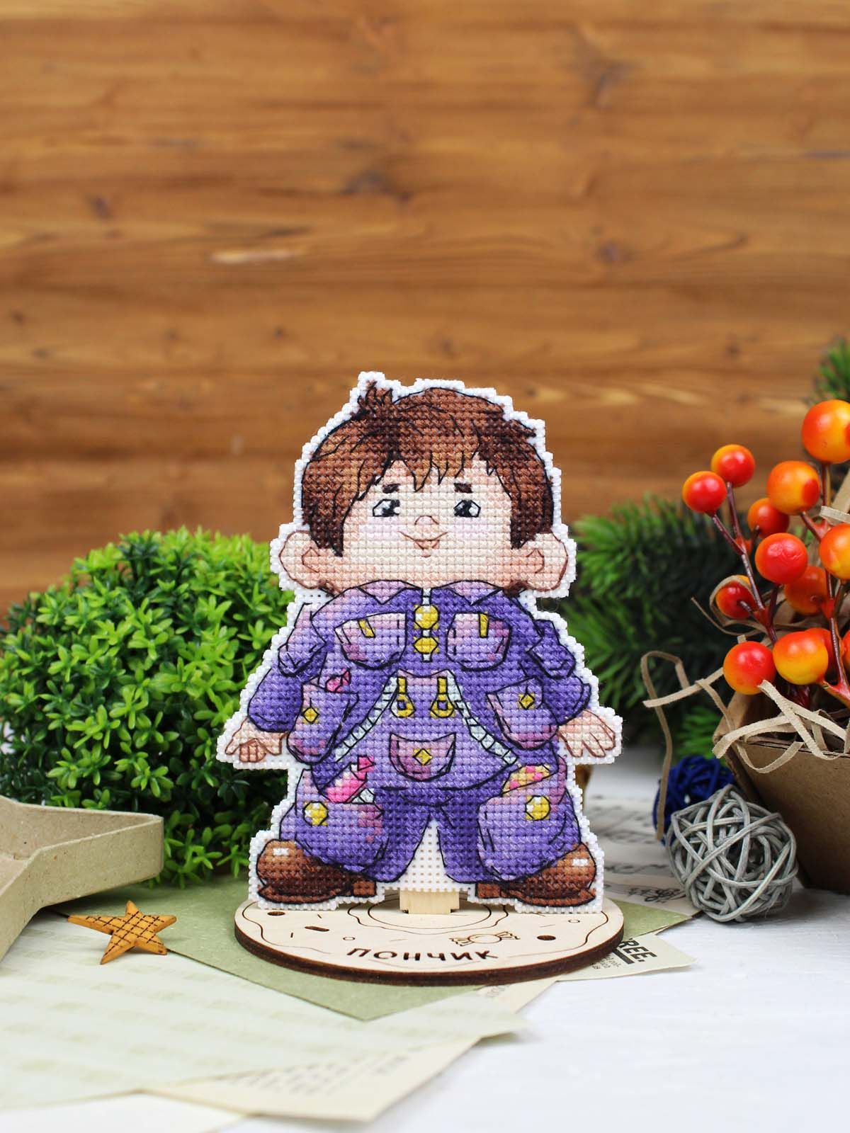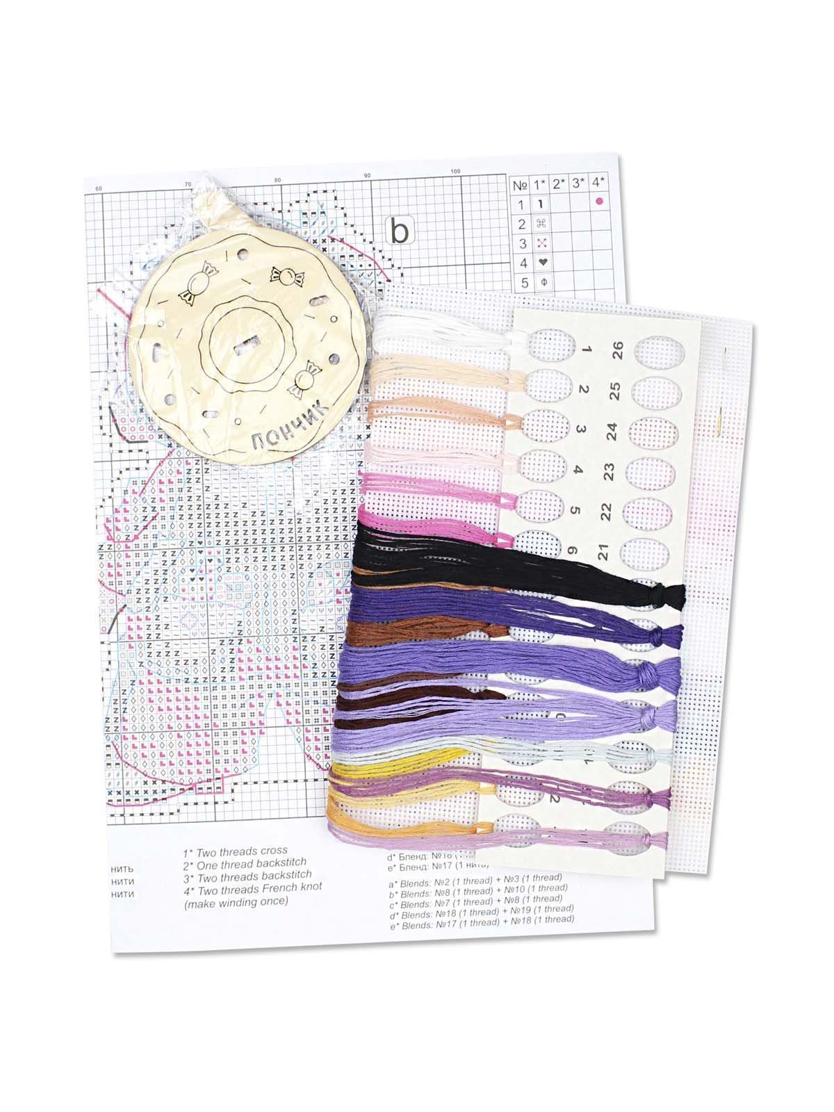 белая пластиковая канва 14 каунта, нитки мулине ПНК им.Кирова 20 цветов, разобранные на органайзере, деревянная подставка, игла, схема бумажная и электронная Makosh, руководство по вышиванию.