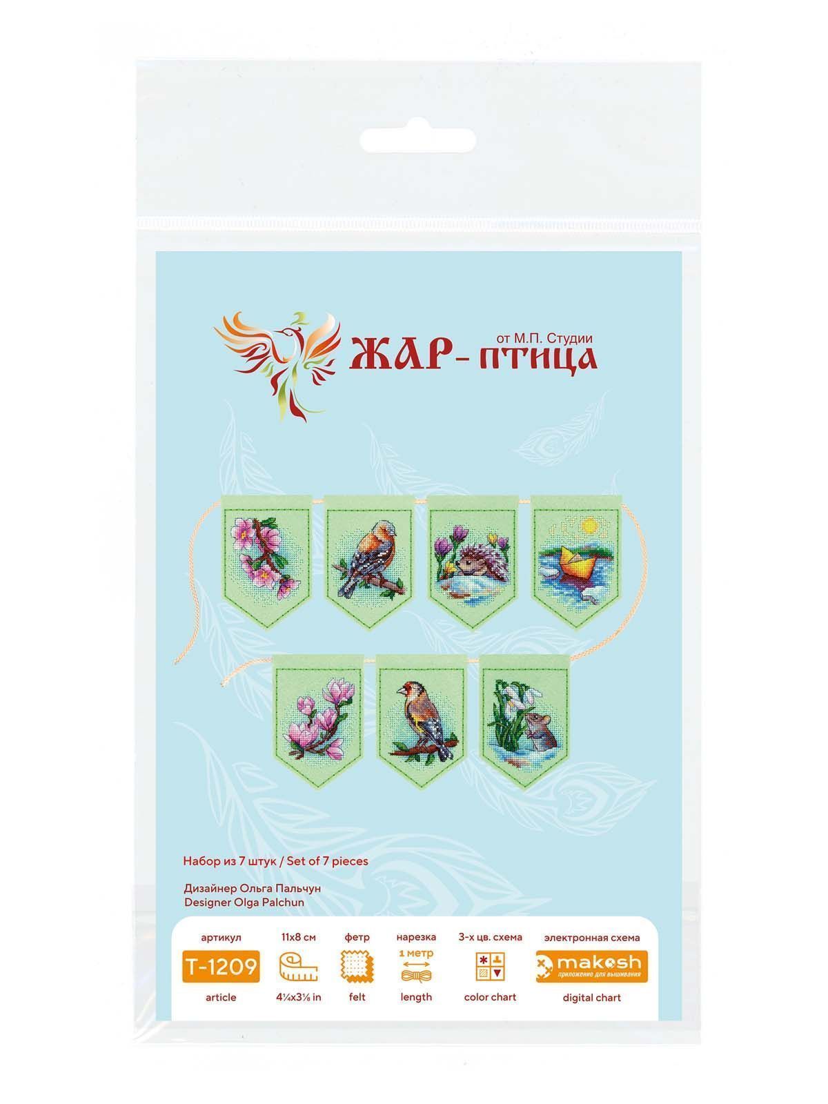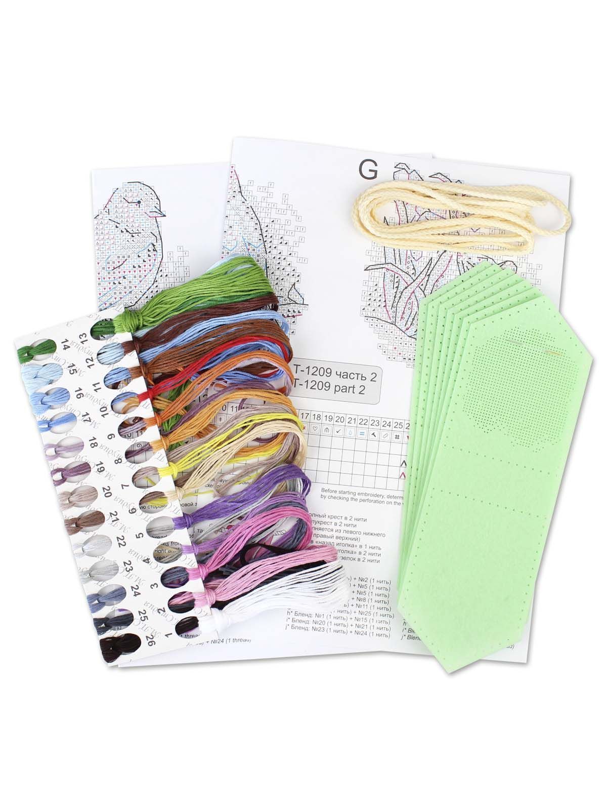 заготовки с перфорацией из фетра светло-зеленого цвета, нитки мулине ПНК им.Кирова 26 цветов, шнур для развески, игла, бумажная схема и электронная схема Makosh, руководство по вышиванию.