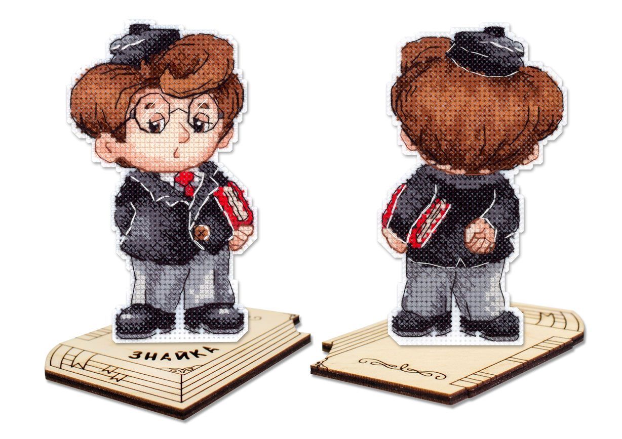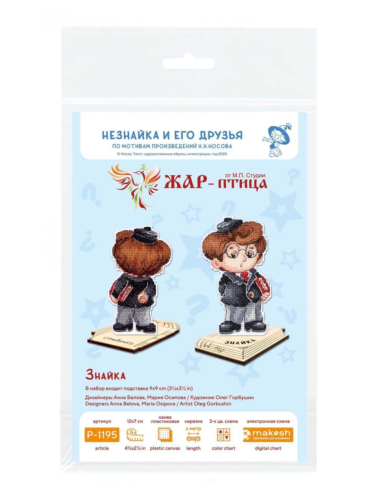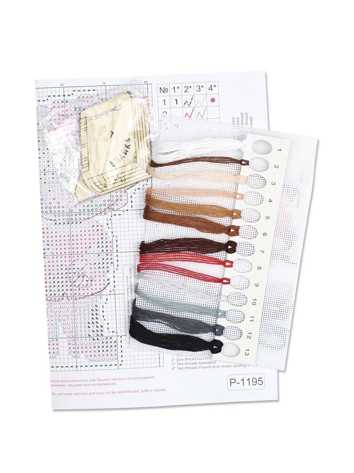 белая пластиковая канва 14 каунта, нитки мулине ПНК им.Кирова 13 цветов, разобранные на органайзере, деревянная подставка, игла, схема бумажная и электронная Makosh, руководство по вышиванию.